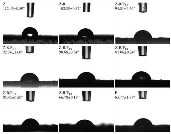 The three-phase contact angle is a very important parameter for the wettability of solid materials. When the three-phase contact angle is less than 90°, it indicates that the solid material has a hydrophilic surface. On the contrary, if the contact angle is more than 90°, the solid material has a hydrophobic surface. Nanoparticles with high hydrophobicity or hydrophilicity are not conducive to stabilizing Pickering emulsions, which causes most particles to be immersed in the oil phase or aqueous phase instead of adsorbed at the oil–water interface. When the contact angle of a solid particle is close to 90°, it is in a state of hydrophilic and hydrophobic equilibrium, which is suitable for the stability of the emulsion [36]. The contact angles of zein particles (Zs), zein–resveratrol conjugates (Z-Rs) and zein–resveratrol/pectin (Z-R/Ps) particles with different mass ratios of Z-R to P and pectin (P) were measured, as shown in Figure 1. Among them, the contact angle of natural zein was 112.46°, which is not much different from the research result of Zhu et al. [37], who found an angle of 113.5°, indicating that zein has high hydrophobicity and poor wettability. Compared with natural zein, the contact angle of Z-R was reduced by about 10°, which showed that the hydrophilicity of the modified zein was improved by grafting it with resveratrol. The contact angle of pectin was 63.77°, indicating it has strong hydrophilicity. For Z-R/P composite particles, the increased pectin concentration led to a gradual decrease in the contact angle. This showed that pectin plays a major role in improving the wettability of Z-R/P particles. This phenomenon was also seen in the work of Jiang et al. [38], who found that in zein nanoparticles prepared with apple pectin, apple pectin was the major contributor to wettability. When the mass ratio of Z-R to P was 2:1, the contact angle was 90.68°, which was the closest to 90°, indicating that the Z-R/P2:1 particle is the most favorable to stabilizing Pickering emulsions.