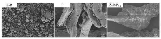 The surface morphology of Z-R, Z-R/P2:1 and P particles was observed using a scanning electron microscope, as shown in Figure 2. Z-R particles were irregularly spherical and had many protrusions on their surface. It was speculated that the protrusions might be the result of protein self-assembly in the process of modifying zein with resveratrol. Pectin particles showed a thick and large strip structure. For the Z-R/P2:1 particle, the presence of pectin made the Z-R particles stick together, and the Z-R particles were wrapped into pectin. Wu et al. [40] found that nanoparticles made from Karaya gum and zein aggregate together and have irregular shapes. Polysaccharides have significant effects on the appearance and size of nanoparticle composites, and endow them with new physical and chemical properties. The adsorption of hydrophilic polysaccharide pectin on the surface of Z-R particles is thought to be beneficial to increasing the surface wettability of the Z-R particles.