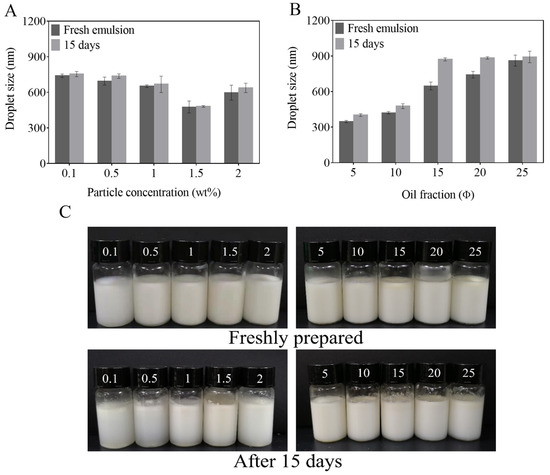 Effects of particle concentration (A) and oil phase fraction (B) on the droplet size and appearance (C) of Pickering emulsions stabilized by Z-R/P2:1 particles for 0 and 15 days of storage.