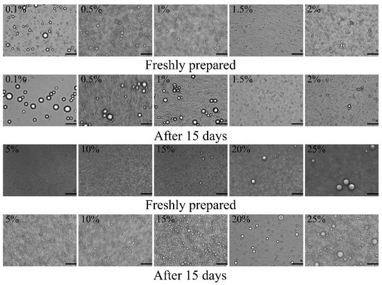 The volume fraction of the oil phase had a remarkable effect on the droplet size of emulsions, because it would change the number of particles that could be adsorbed on the oil–water interface. Emulsions containing different volume fractions of the oil phase (5–25%) were prepared with a fixed Z-R/P2:1 particle concentration of 1.5 wt%, and the effects of the volume fraction of the oil phase on the visual appearance, droplet size and microstructure of emulsions were investigated. As shown in Figure 3B, the increasing droplet size of the emulsion was affected by an increasing oil phase volume fraction. After 15 days of storage, the droplet size of the emulsion with the 5% oil phase volume fraction demonstrated little change and was still the smallest at only 401.7 nm. There was no stratification in any of the emulsions with different oil phase volume fractions; they were still uniform milky white liquids (Figure 3C). As shown in Figure 4, in the observation of optical microstructure, the increased oil phase volume fraction led to an increase in emulsion droplet size and uneven distribution, which was due to the increase in the oil phase volume fraction, and oil droplets tended to aggregate and form a lipid layer [42]. The droplet size of the emulsions with 5% and 10% volume fractions of the oil phase did not change significantly after 15 days of storage. However, in other emulsions with oil phase volume fraction of 15%, 20% and 25%, larger droplets appeared, and the aggregation phenomenon was obvious. Therefore, the volume fraction of the oil phase was selected as 5% for the follow-up study.