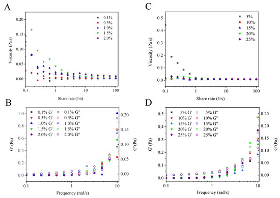 Rheological properties of Pickering emulsions with different Z-R/P2:1 concentrations and oil phase volume fractions were measured, (Figure 5). As shown in Figure 5A,C, during the increase in apparent viscosity from 0.1 to 100 s−1 with the shear rate, all of the emulsions exhibited shear thinning behavior. This phenomenon mainly reflected the anti-flocculation behavior of oil droplets in emulsions. The high shear rate destroyed the inner structure of droplets, and the droplets tended to reorder themselves to obtain a new equilibrium in the direction of flow [44]. In all emulsions, the storage modulus (G′) was higher than the loss modulus (G′′) in the process of increasing the frequency from 0.1 to 10 rad/s, as shown in Figure 5B,D, which indicated that the emulsion stabilized by Z-R/P2:1 particles had an elastic gel-like structure.