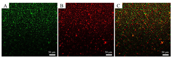 The interfacial microstructure of the Pickering emulsions stabilized by Z-R/P2:1 particles was observed by CLSM. As shown in Figure 6, Nile red was used to stain the oil phase and Nile blue was used to stain the Z-R/P2:1 particles. The green (Figure 6A) and red (Figure 6B) fluorescence fields represent the oil phase and Z-R/P2:1 particles, respectively. Figure 6C shows a superimposed fluorescence image of Pickering emulsions. The oil phase was inside the droplet, while the Z-R/P2:1 particles adsorbed on the border of the droplet to form a dense filling barrier which acted as a physical layer to enhance the stability of Pickering emulsions [45].