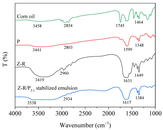 FTIR is usually used to determine the interaction information between components. As shown in Figure 7, the characteristic peaks of amide I band and amide II band of Z-R were at 1631 cm−1 and 1449 cm−1, respectively, and the peak at 2960 cm−1 was the asymmetric stretching vibration of methylene −CH2 in Z-R. The three characteristic peaks of pectin were at 3441, 1599 and 1348 cm−1, respectively. The wide peak at 3441 cm−1 was the O-H stretching vibration, the 1599 cm−1 peak was caused by antisymmetric stretching vibration of carbonyl group in carboxylate ions, and the peak at 1348 cm−1 was made by the symmetric stretching vibration of the carbonyl group [46]. The three peaks of pectin changed in the Z-R/P2:1-stabilized emulsion, which indicated there were interactions between Z-R and pectin. The O-H peak blue shifted from 3441 cm−1 to 3538 cm−1, and the wavenumber shifted greatly, indicating that there was a strong hydrogen bond interaction between pectin and Z-R. The vibrational peaks of carboxylate ions at 1599 and 1348 cm−1 moved to 1617 and 1384 cm−1, respectively, demonstrating that there was an electrostatic interaction between pectin and Z-R. In the infrared spectrum of corn oil, the peak at 3458cm−1 was the stretching vibration of O-H and frequency doubling peak of C = O, while 2854 cm−1 was the absorption peak of methylene [47], the absorption peak at 1745 cm−1 was produced by the stretching vibration of carbonyl in saturated fatty acid ester, and the peak at 1464 cm−1 was due to the −CH2 bending vibration mode. However, these characteristic peaks of corn oil disappeared in the emulsion, being covered by the peaks of the Z-R/P2:1 complex. This might have been due to the dense protective film formed on the surface of oil drops by Z-R/P particles.