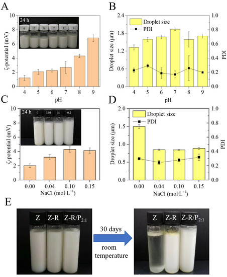 Effect of different pHs on the appearance, ζ-potential (A), droplet size and PDI (B) of Z-R/P2:1-stabilized emulsions after 24 h of storage. Effect of different NaCl concentrations on the appearance, ζ-potential (C), droplet size and PDI (D) of Z-R/P2:1-stabilized emulsions after 24 h of storage. The appearance (E) of emulsions stabilized by Z, Z-R and Z-R/P2:1 particles before and after 30 days of storage at room temperature.