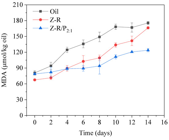 Evolution of malondialdehyde (MDA) under storage at room temperature for 14 days in Z-R-particle-stabilized Pickering emulsion and Z-R/P2:1-particle-stabilized Pickering emulsion, with corn oil without stabilizer used as a control.