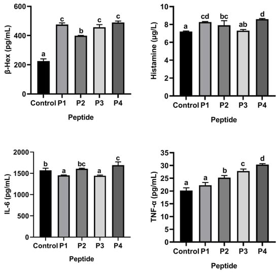β-Hex, histamine, IL-6 and TNF-α release of KU812 cells in the presence of ω-5 gliadin-derived peptides (150 μg/mL). Note: Different letters indicate significant differences between groups (p < 0.05).