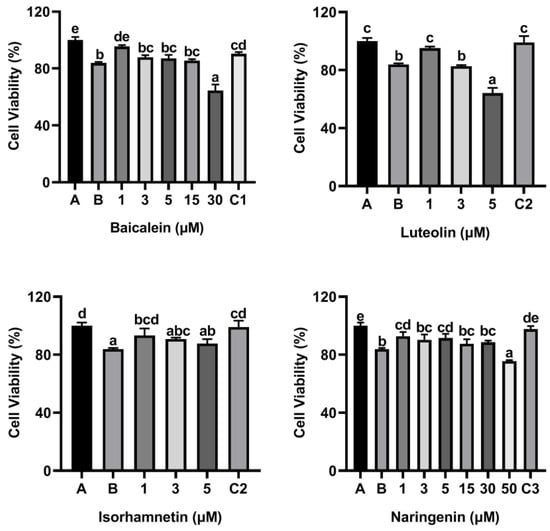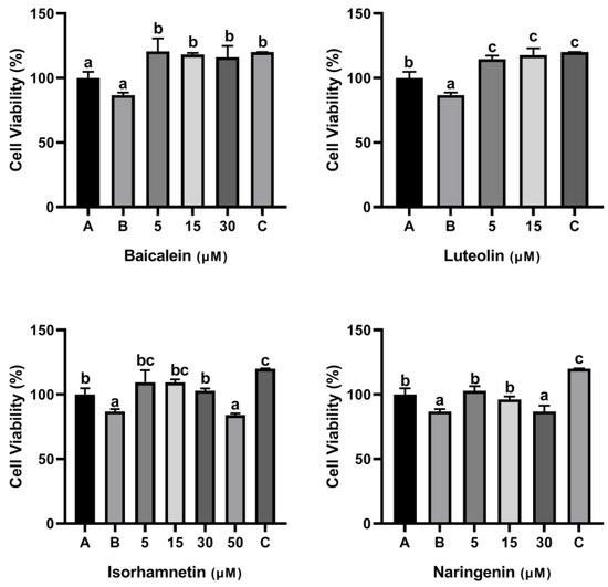 Effects of four flavonoids on the viability of Caco-2 cells induced by ω-5 gliadin-derived peptide P4. A (blank group): only Caco-2 cells; B (control group): 500 μg/mL ω-5 gliadin-derived peptide P4+Caco-2 cells; C (positive control group): 10 nM Dexamethasone+Caco-2 cells. Note: different letters indicate significant differences between groups (p < 0.05).