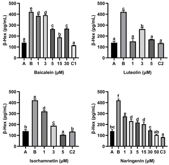 Effect of four flavonoids on the release of β-Hex from KU812 cells induced by ω-5 gliadin-derived peptide P4. A (blank group): Only KU812 cells; B (control group): 150 μg/mL ω-5 gliadin-derived peptide P4+KU812 cells; C1 (positive control group): 30 μM ketotifen fumarate + KU812 cells; C2 (positive control group): 5 μM ketotifen fumarate + KU812 cells; C3 (positive control group): 50 μM ketotifen fumarate + KU812 cells. Note: different letters indicate significant differences between groups (p < 0.05).