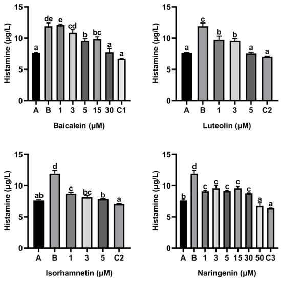 Effect of four flavonoids on the release of histamine from KU812 cells induced by ω-5 gliadin-derived peptide P4. A (blank group): only KU812 cells; B (control group): 150 μg/mL ω-5 gliadin-derived peptide P4+KU812 cells; C1 (positive control group): 30 μM ketotifen fumarate + KU812 cells; C2 (positive control group): 5 μM ketotifen fumarate + KU812 cells; C3 (positive control group): 50 μM ketotifen fumarate + KU812 cells. Note: different letters indicate significant differences between groups (p < 0.05).