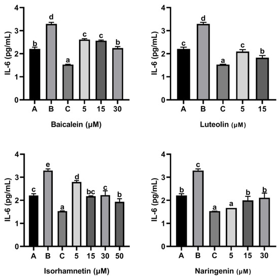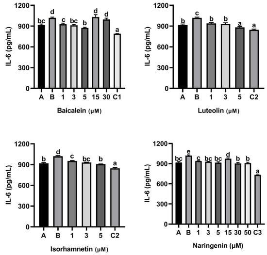 As shown Figure 5, compared with the control group only treated with peptide P4 (150 μg/mL), baicalein, luteolin, isorhamnetin and naringenin all reduced the release of IL-6 induced by peptide P4. Notability, the inhibitory effect of baicalein on release of IL-6 induced by peptide P4 did not increase with increasing concentration, and when the acting concentration of baicalein increased to 15 µM and 30 µM, the inhibitory effect disappeared.