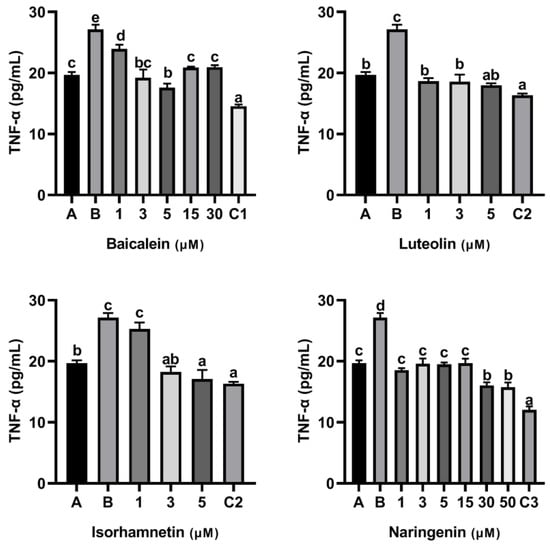 Effect of four flavonoids on the release of TNF-α from KU812 cells induced by ω-5 gliadin-derived peptide P4. A (blank group): only KU812 cells; B (control group): 150 μg/mL ω-5 gliadin-derived peptide P4+KU812 cells; C1 (positive control group): 30 μM ketotifen fumarate + KU812 cells; C2 (positive control group): 5 μM ketotifen fumarate + KU812 cells; C3 (positive control group): 50 μM ketotifen fumarate + KU812 cells. Note: different letters indicate significant differences between groups (p < 0.05).