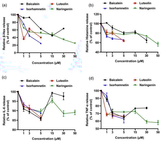 In addition, we drew dose- effect curve, and compared the anti-degranulation activity and the anti-inflamatory efficacy of the four flavonoids (Figure 7). Except baicalein, the anti-inflamatory efficacy of luteolin, isorhamnetin and naringenin increased with increasing concentration. At a concentration of 5 µM, we found the anti-degranulation activity of isorhamnetin and luteolin was greater than that of naringenin and baicalein.