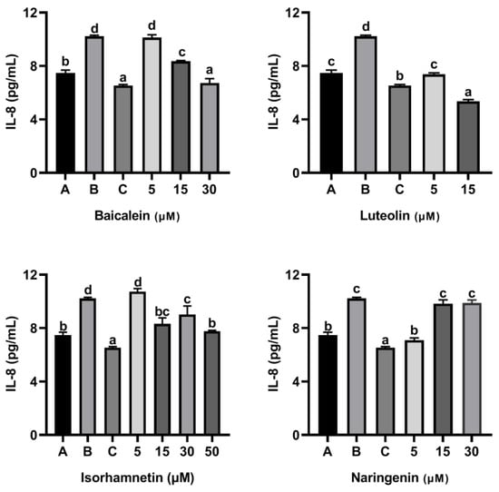Effect of four flavonoids on the release of IL-8 from Caco-2 cells induced by ω-5 gliadin-derived peptide P4. A (blank group): only Caco-2 cells; B (control group): 150 μg/mL ω-5 gliadin-derived peptide P4+Caco-2 cells; C (positive control group): 10 nM Dexamethasone+Caco-2 cells. Note: different letters indicate significant differences between groups (p < 0.05).