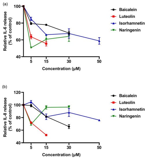 These results indicated that the four flavonoids reduced the inflammation reaction of Caco-2 cells caused by ω-5 gliadin-derived peptide. Notably, baicalein, luteolin and isorhamnetin gradually decreased the secretion of IL-6 and IL-8 with the increase of concentration, while naringenin treatment showed the opposite effect (Figure 11). The inhibitory effect decreased when the acting concentration of naringenin increased from 5 µM to 15 µM and 30 µM, even the inhibitory effect to IL-8 release disappeared. In addition, the inhibitory action of naringenin and luteolin on the release of IL-6 and IL-8 from Caco-2 cells was greater than that of baicalein and isorhamnetin at a concentration of 5 µM, which was different from the order of the anti-degranulation effect of the four flavonoids.