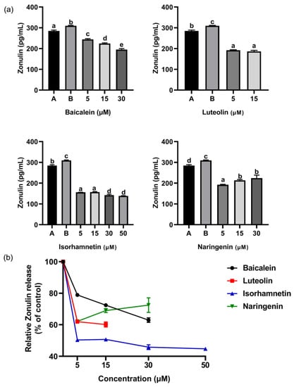 (a) Effect of four flavonoids on the release of Zonulin from Caco-2 cells induced by ω-5 gliadin-derived peptide P4. A (blank group): only Caco-2 cells; B (control group): 150 μg/mL ω-5 gliadin-derived peptide P4+Caco-2 cells; note: different letters indicate significant differences between groups (p < 0.05); (b) dose-effect relationship of four flavonoids of inhibition zonulin release.