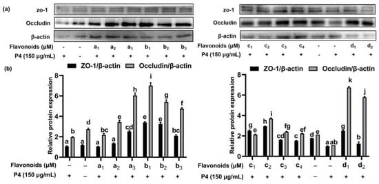 Effect of four flavonoids pretreatment on expression of occludin and ZO-1 protein. (a) Representative immunoblots of the indicated proteins are shown; (b) relative protein expression of occludin and ZO-1; a1: 5 μM baicalein; a2: 15 μM baicalein; a3: 30 μM baicalein; b1: 5 μM naringenin; b2:15 μM naringenin; b3: 30 μM naringenin; c1: 5 μM isorhamnetin; c2: 15 μM isorhamnetin; c3: 30 μM isorhamnetin; c4: 50 μM isorhamnetin; d1: 5 μM luteolin; d2: 15 μM luteolin; +: cells were treated with peptide P4; -: cells weren’t treated with flavonoids or peptide P4. Note: different letters indicate significant differences between groups (p < 0.05).