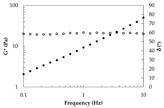 Frequency sweep tests at 25 °C and in linear conditions (preliminary stress sweep tests were carried out to evaluate the linear viscoelastic region) were performed between 0.1 and 10 Hz. All measurements were repeated three times; the results are shown in terms of mean value and standard deviation.