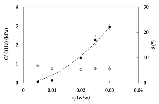 Storage modulus G’ (1 Hz, full symbols) and phase angle δ (°, open symbols) of fiber suspensions as a function of fiber fraction. Experimental data (full symbols) and fractal model fitting of G’ (dashed line, Equation (4)).