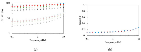 Frequency sweep tests of emulgels (1% w/w dietary fiber, 20% w/w oil phase) at different specific mixing powers and at specific energy E2s = 45.2 J/g. (a) Storage modulus (G’, solid symbols) and loss modulus (G″, open symbols); (b) loss tangent (tanδ, solid symbols). E2.1.1.20: black triangles, E2.2.1.20: green diamonds, E2.3.1.20: red squares, E2.4.1.20: blue circles.