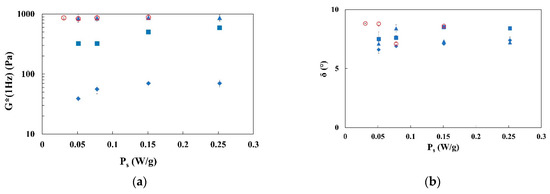 Complex modulus (G*) and phase angle (δ) at 1 Hz for all investigated samples are shown in Figure 5 and listed in Table 2. Looking at the results in Figure 5a, complex modulus (G*) increases with the fiber content and, with the highest fractions of fiber added to water; no differences are visible among data, neither with energy of mixing nor with power.