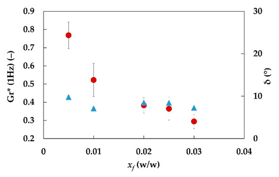 Relative complex modulus (1 Hz) (red circles) and phase angle δ (1 Hz) (blue triangles) of emulgels with 20% w/w of oil phase, at different fiber fraction and constant preparation conditions (E2.3.y.20 samples). Operating energy and power of mixing for emulgels and aqueous suspensions: Es = 45.2 J/g and Ps = 0.151 W/g.