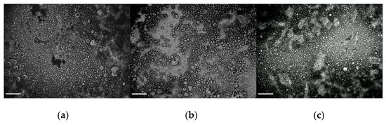 Contrast phase micrographs for samples E2.3.1.20 (a), E2.3.3.20 (b) and E2.3.3.30 (c); magnification 20×; reference bar corresponds to 100 µm.