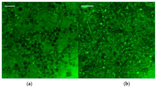As expected, the emulgel with the highest fiber fraction (Figure 8b) shows a more compact network in which many fluorescent particles are present, whereas the droplets seem to be less visible, i.e., more wrapped by the surrounding matrix of hydrated fibers. The figures suggest that, mostly at the highest fiber fraction, the oil droplets are not perfectly spherical, probably owing to the break-up action of the mechanical device.