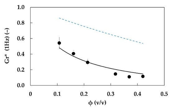Because of these deviations, a modified form of the Palierne model can be proposed to fit experimental data, and Equation (18) can be used to describe the observed behavior even if “ψ”, in this case, is mainly an empirical parameter taking into account all deviations from ideal Palierne behavior more than high volume conditions. If Equation (18) is adopted to fit experimental data, a good agreement can be observed even if larger deviations are observed at higher volume fractions. The obtained fitting parameter is ψ = 15 ± 2 (−).