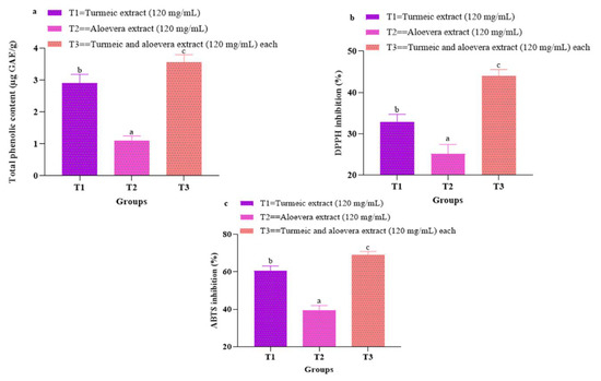 (a–c) Total phenolic content, DPPH and ABTS (%) inhibition of turmeric, aloe vera and combination of both extracts. Means bearing different superscripts with small letters a, b, c along a row differ significantly at (p < 0.05). T1: turmeric extract (120 mg/mL); T2: aloe vera extract (120 mg/mL); T3: turmeric (120 mg/mL) and aloe vera (120 mg/mL) extracts.
