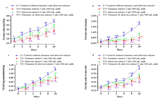 (a–d) Effect of turmeric and aloe vera extracts on tyrosine value and lipid oxidation attributes of goat and buffalo paneer during refrigerated aerobic storage. Means bearing different superscripts with small letters a, b, c, d and subscripts with capital letters A, B, C, D along a row and column, respectively, differ significantly at (p < 0.05). C: Control paneer without turmeric and aloe vera extracts, T1: Paneer with turmeric extract (5 mL/100 mL) v/v of milk; T2: Paneer with aloe vera extract (5 mL/100 mL) v/v of milk; T3: paneer with turmeric extract (5 mL/100 mL) v/v of milk and aloe vera extract (5 mL/100 mL) v/v of milk.