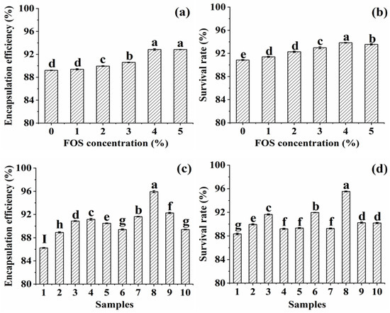 Figure 1a depicted the effect of the FOS concentration on the EE of encapsulated probiotics. It was observed that the EE of L. plantarum GIM1.648 significantly increased with the increase in FOS concentration and reached the highest value of 92.8% at 4% FOS (p < 0.05). The further increase in FOS concentration above 4% did not significantly change the EE (p > 0.05). This might be that the addition of FOS caused the structure of microcapsules to be more rigid to protect probiotics. A similar study had encapsulated Lacticaseibacillus rhamnosus with SA and different concentrations of FOS by extrusion technique and the EE of cells was found to vary from 84% to 91% [23]. The introduction of FOS had an obvious effect on the survivability of probiotics in the process of in vitro digestion (Figure 1b). The SR of encapsulated L. plantarum GIM1.648 increased when the FOS concentration ranged from 0 to 4% and reached the maximum of 93.8% at 4%. This possible reason was that FOS could fill the pores of microcapsules to prevent the diffusion of simulated gastrointestinal fluids into them; on the other hand, FOS could act as an energy source that was metabolized by probiotics to maintain their growth throughout the process. This result was consistent with the previous report [14], in which they produced L. acidophilus microcapsules containing Hi-maize by external ionic gelation and found that the addition of Hi-maize resulted in a higher count of viable cells after being exposed to simulated gastrointestinal conditions. Hence, 4% FOS was considered to be optimal for preparation of the SPI-F-L-P microcapsules.