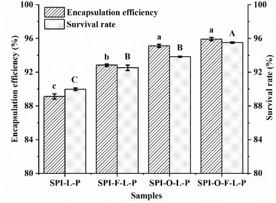 The EE and SR of L. plantarum GIM1.648 encapsulated in the synbiotic microcapsules containing the optimal amount of distinct substrate were compared and the results were shown in Figure 2. The EE of probiotics encapsulated in the SPI-L-P, SPI-F-L-P, SPI-O-L-P, and SPI-O-F-L-P were 89.1%, 92.8%, 95.1%, and 95.9%, respectively. It indicated that addition substrates significantly enhanced the EE of cells (p < 0.05), but there was no significant difference between SPI-O-L-P and SPI-O-F-L-P (p > 0.05). In terms of the SR of cells after in vitro digestion, the corresponding values for the synbiotic microcapsules of SPI-F-L-P, SPI-O-L-P, and SPI-O-F-L-P were 92.5%, 93.8%, and 95.5%, respectively. Significant differences were found between the control group of SPI-L-P and three types of synbiotic microcapsules (p < 0.05), but no significant difference was observed between SPI-F-L-P and SPI-O-L-P (p > 0.05). These results indicated that the beneficial effect of fish oil was greater than or equal to FOS and the FOS and fish oil complex had the most outstanding performance. This phenomenon might be due to the synergistic effect between FOS and fish oil [25].