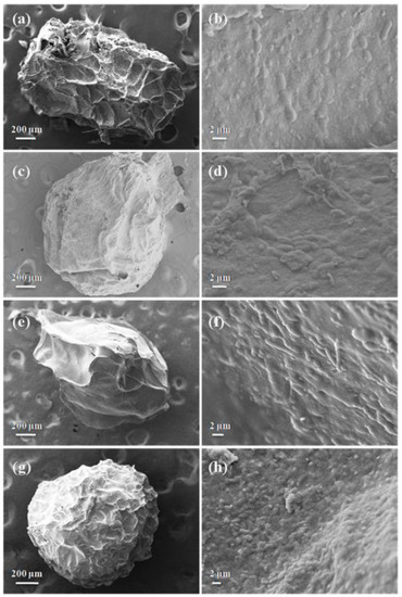 The SEM images of the surface and internal morphology of the various microcapsules were shown in Figure 3. It was found that the structure of SPI-L-P was irregular, winkled, and with a broken and pitted surface (Figure 3a). However, the three synbiotic microcapsules exhibited a less spherical shape with distinct surface characteristics. Compared to SPI-L-P, SPL-F-L-P, and SPL-O-L-P, they provided a smoother and more compact surface with less wrinkles and dents. The previous study also reported that the inclusion of FOS to the alginate–gelatin matrix formed a more interconnected network and reduced its pore size [26]. Similarly, Vaziri et al. found that the microcapsules containing L. plantarum and DHA-rich oil showed smoother surfaces with less concavities [27]. The possible reason was that the addition of FOS improved the polymeric distribution and helped to fill the pores of microcapsules; in addition, the incorporation of fish oil could reduce the water evaporation and increase the moisture content in microcapsules [17,23]. For SPI-O-F-L-P, it presented the most smooth and compact surface with the least dents among the samples (Figure 3g). The synergistic effect between the fish oil and FOS might account for this. From the SEM images of the cross section of all microcapsules (Figure 3), bacterial cells were obviously observed, but there were no cells on the surface of microcapsules, which meant that they were fully covered inside of the microcapsules.