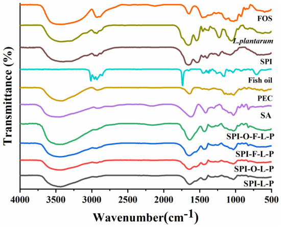 Fourier transform infrared spectroscopy (FTIR) spectra of different samples (SPI, PEC, SA, FOS, fish oil, L. plantarum GIM1.648, and various microcapsules) were conducted by a FTIR spectroscopy (Bruker Model Equinox 55, Ettlingen, Germany) in the spectra range of 4000–500 cm−1 with 4 cm−1 resolution to investigate their chemical interactions and structure characteristics.