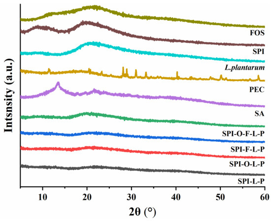 The XRD patterns of different samples were depicted in Figure 5. The SPI exhibited board peaks at 9° and 21° and FOS presented broad peaks at 12° and 23°, demonstrating their amorphous structure with a crystalline region [21,31]. A sharp crystalline peak was observed at 13.4° in the pattern of SA, which was reported previously as a typical peak of SA [32]. However, these characteristic peaks almost disappeared in XRD patterns of various microcapsules, which can be attributed to the formation of amorphous complex between polysaccharide and protein by intermolecular interactions, causing the intensity of diffraction peaks to decrease and broadening the patterns. From the XRD pattern of L. plantarum GIM1.648, it showed wide diffraction peak at 21°, but the peak intensity progressively reduced in different microcapsules, indicating that bacterial cells were trapped into microcapsules in an amorphous state. The XRD curves of different microcapsules were similar in shape, whereas SPI-O-F-L-P showed a greater peak intensity at 21° than other synbiotic microcapsules, probably due to the SPI-O-F-L-P containing more probiotics.