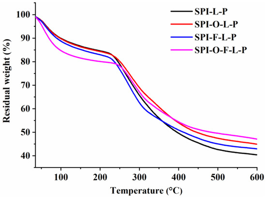 Figure 6 shows that all the microcapsules had three thermal degradation stages. There were little differences for all samples during whole thermal degradation stages. The temperatures at a maximum weight loss rate of different microcapsules were 263.8 °C for SPI-L-P, 276.8 °C for SPI-F-L-P, 277.0 °C for SPI-O-L-P, and 282.4 °C for SPI-O-F-L-P. Meanwhile, the percentages of the final residual weight of SPI-L-P, SPI-F-L-P, SPI-O-L-P, and SPI-O-F-L-P were 40.42%, 42.96%, 44.98%, and 47.12%, respectively. These results suggested that the presence of substrates improved the thermal stability of probiotics in synbiotic microcapsules. SPI-O-F-L-P had the best thermal stability among the three synbiotic microcapsules, probably because of the incorporation of FOS and the fish oil complex caused more compact and dense structure of microcapsules.