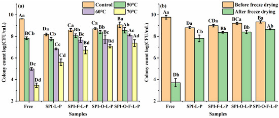 Figure 7a displayed the thermal tolerance of free and encapsulated cells after heat treatment at 50 °C, 60 °C, and 70 °C for 30 min. Apparently, the cell viability of all samples decreased with the increase in treatment temperature and the higher the temperature, the greater the loss of cell viability. However, compared to free cells, the encapsulated cells showed better heat resistance and the thermal stability of different microcapsules followed by a sequence of SPI-O-F-L-P > SPI-F-L-P ~ SPI-O-L-P > SPI-L-P. For example, after treatment at 70 °C, the free cells showed a reduction of 5.92 log CFU/mL, but the corresponding values were 2.56, 1.87, 1.71, and 1.60 log CFU/mL for SPI-L-P, SPL-F-L-P, SPL-O-L-P, and SPI-O-F-L-P, respectively. The heat resistance of SPI-F-L-P and SPI-O-L-P were significantly higher when compared to SPI-L-P (p < 0.05), but there was no statistical change between them. Among all the synbiotic microcapsules, the SPI-O-F-L-P maintained the highest count of viable cells (7.37 log CFU/mL), which was significantly higher than the others (p < 0.05). Overall, these results suggested that encapsulation is an important way to improve the heat resistance of probiotics. Moreover, the presence of substrates, especially the complex of FOS and fish oil, could significantly enhance the thermal stability of encapsulated probiotics, which were consistent with the above TGA results. It was probably because the synbiotic microcapsules possessed more compact and dense structures, which effectively slow down or isolate the effects of heating on probiotics [33].