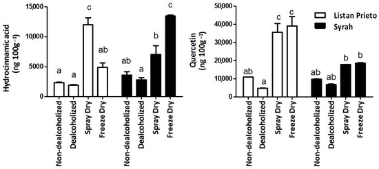 Samples obtained from the spray drying process were atomized and dried at high temperatures. Listan Prieto sprays dry samples presented higher hydrocinnamic acid and quercetin content than most of the rest of the studied treatments, except for Listan Prieto freeze dry (Figure 2). Ma et al. [52] reported an increase in phenolics due to the drying process at high temperatures that might be attributed to a release of bound phenolics from the tissue caused by drying. In this way, quercetin and ellagic acid were reported to present the highest thermal stability above most of the phenolic compounds [53]. Based on this, it is probable that the drying process in quercetin did not affect its content despite the freeze and high temperatures used in each of the drying processes. On the other hand, Listan Prieto dried samples presented higher content of quercetin than the Syrah dried samples (Figure 2). Despite that Listan Prieto grapes are characterized by their low phenolic content, Heras-Roger et al. [34] showed that flavonol proportion of myricetin and quercetin derivatives are higher in Listan Prieto than in Syrah. In addition, some individual flavonols were higher in Listan Prieto wines than in most of the other studied varieties, including Syrah [34,40]. In general, yields of all wine samples after encapsulation process varied from 78 to 85% with no statistically significant difference among variables.