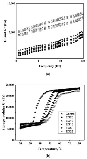 3.2.6. The Influence of Heat on the Rheological Characteristics of the PEG-Added Meat Emulsion