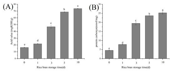 As shown in Figure 1, with the prolongation of RB storage time, the acid value of RB crude oil and the carbonyl content of RBP increased significantly (p < 0.05). The phenomena indicated that during RB storage, RB rancidity and RBP oxidation simultaneously occurred. RB contained highly active lipase, which could rapidly catalyze the hydrolysis of lipids to form free fatty acids. The free fatty acids were unstable and easily oxidized to produce various reactive oxygen species, which resulted in protein oxidation [5].