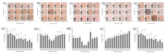 Effects of ultrasonic intensity on microstructure for stored 0 d of RBPE prepared from RB with different storage times ((A)—0 d, (B)—1 d, (C)—3 d, (D)—5 d, (E)—10 d) and effects of ultrasonic intensity on CI for stored 7 d of RBPE prepared from RB with different storage times ((F)—0 d, (G)—1 d, (H)—3 d, (I)—5 d, (J)—10 d). The different lowercase letters within a column indicate significant differences (p < 0.05).
