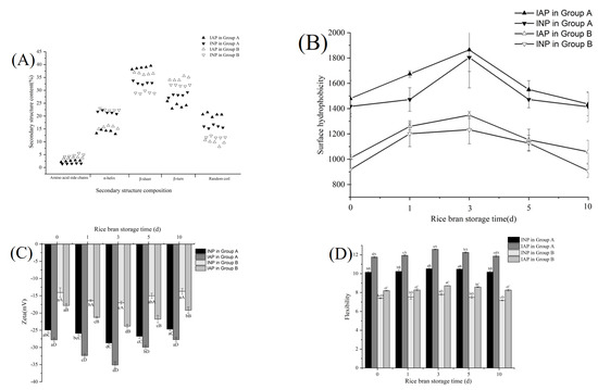 As shown in Figure 3C, the zeta potential of IAP and INP in group A was significantly lower than that in group B (p < 0.05), which might be ascribed to the optimal ultrasonic intensity-unfolded protein and exposed charged amino acids to the protein surface, thus enhancing the electrostatic repulsion between proteins [29]. The zeta potential of IAP in both groups was lower than that of INP, which indicated that the IAP structure was more unfolded than INP. This phenomenon might be due to the fact that highly unfolded protein is more prone to adsorbing to the oil–aqueous interface [5]. Moreover, with the prolongation of RB storage time, the zeta potential of IAP and INP in both groups initially decreased and then increased, which might be ascribed to the inability of protein aggregates caused by excessive oxidation to effectively unfold under optimal ultrasonic intensity.