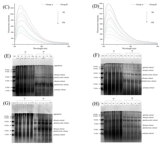 Figure 4E–H shows the electropherograms of IAP and INP in the two groups, respectively. The molecular weight of the interface protein subunits of RBPE mainly ranged from 7 to 80 kDa [5,32]. There was no change in the number of bands in reducing and non-reducing electrophoresis, indicating that the subunits of IAP and INP did not change during ultrasonic treatment and RB storage [6]. Compared with the reduced electropherogram, the aggregation bands and the prolamin subunit bands became lighter. The phenomenon showed that the disulfide bonds were cleaved by β-mercaptoethanol in the reduced electropherogram [6]. The aggregation bands, albumin subunit bands, and glutelin acidic subunit bands of IAP and INP in group B were darker than those in group A, suggesting that the protein structure in group B was more aggregated [5].