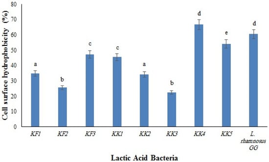 Cell surface hydrophobicity of the LAB isolates compared to the control strain, L. rhamnosus GG. Different letters show significant differences (p < 0.05).