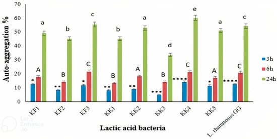 Auto-aggregation of the LAB isolates after 3, 6, and 24 h of incubation, compared to the control strain, L. rhamnosus GG. ∗∗∗∗ p < 0.0001, ∗∗∗ p < 0.001, ∗∗ p < 0.01, and ∗ p < 0.05. Different letters show significant differences (p < 0.05).