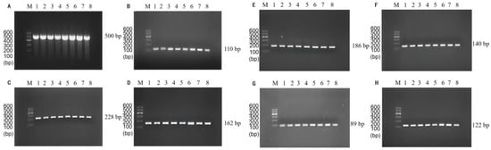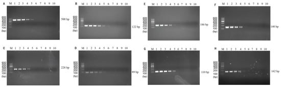 The sensitivity of single PCR was verified by diluting the genome concentration, and the results showed that the method effectively achieved a low DNA concentration detection limit. The genomes of P. putida with only 14 pg (Figure 3A), V. alginolyticus with 1.8 pg (Figure 3B), V. vulnificus with 170 pg (Figure 3C), V. parahaemolyticus with 20 pg (Figure 3D), C. sakazakii with 15 pg (Figure 3E), S. flexneri with 13 pg (Figure 3F), E. coli O157:H7 with 15 pg (Figure 3G), and L. monocytogenes with 1.5 pg (Figure 3H) of DNA were successfully detected.