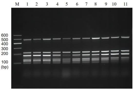 Multiplex PCR amplification at the different annealing temperatures. Lane M: DNA marker B 600; Lane 1~11: Annealing temperature is 48 °C, 49 °C, 50 °C, 51 °C, 52 °C, 53 °C, 54 °C, 55 °C, 56 °C, 57 °C, and 58 °C, respectively.