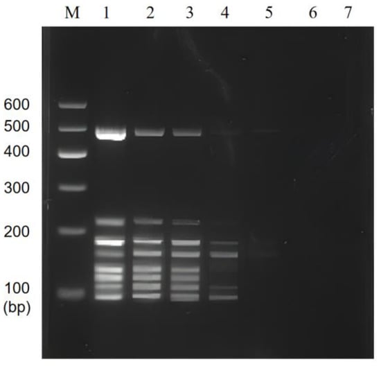 Because pathogenic bacteria can pose a greater risk to human health, there is a need to focus on their detection to reduce these bacteria in food. The traditional culture incubation method (gold standard) is generally used to detect bacteria. However, this method requires multiple experimental steps, including isolation and culture and biochemical and serological experiments. In addition, the operation of the traditional method is cumbersome and time-consuming and can only achieve a single test. As a result, the traditional culture method is ineffective in detecting the increasing number of bacterial species. Therefore, new detection methods and technologies need to be developed. Molecular biology detection technology, particularly the multiplex polymerase chain reaction (PCR) variant of conventional PCR, has been initially applied to simultaneously detect various pathogenic microorganisms. The method possesses the advantages of high efficiency, low cost, high speed, and high operability. The multiplex PCR assay is a technique recently developed to diagnose and identify multiple genomes simultaneously within four hours []. Multiplex PCR can be used to simultaneously detect highly virulent L. monocytogenes as the target strain at a minimum concentration of 104 CFU/mL within 48 h []. Hernandez et al. successfully detected 1~10 CFU of Shigella and Salmonella from food samples within 24 h at low detection limits []. Li et al. also used multiplex PCR to detect the genomic DNA of four pathogenic bacteria with a detection limit of 100 pg/μL []. Ashraf et al. successfully detected pathogenic bacteria from milk samples at a concentration of 104 CFU/mL []. The identification efficiency of multiplex PCR is higher than that of single PCR. In addition to reducing the detection time, multiplex PCR reduces the detection cost. Thus, multiplex PCR assays are important for the rapid and multiple identifications of pathogenic bacteria in mixed samples.