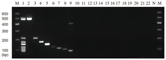 Results of multiplex PCR specificity. Lane M: DNA marker B 600; Lane 1: Mixed 8 target DNA as templates; Lane 2~22: The DNA templates were P. putida, V. vulnificus, C. sakazakii, L. monocytogenes, S. flexneri, V. alginolyticus, E. coli O157:H7, V. parahaemolyticus, E. coli EAEC, E. coli ETEC, S. pyogenes, Y. enterocolitica-1, Y. enterocolitica-2, S. aureus, P. aeruginosa, V. minima, V. cholerae (Vbo), B. cereus, E. coli EPEC, S. enterica, and K. pneumoniae, respectively; Lane N: Negative control group without the addition of DNA template.