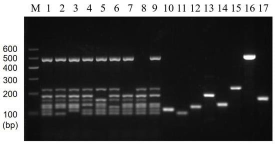 Results of multiplex PCR stability. Lane M: DNA marker B 600; Lane 1: Mixed 8 target DNA as templates; Lane 2~9: 8 mixed templates based on 7 templates missing E. coli O157:H7, V. parahaemolyticus, V. alginolyticus, C. sakazakii, S. flexneri, V. vulnificus, P. putida, and L. monocytogenes, respectively; Lane 10~17: Single DNA templates E. coli O157:H7, V. parahaemolyticus, V. alginolyticus, C. sakazakii, S. flexneri, V. vulnificus, P. putida, and L. monocytogenes, respectively.
